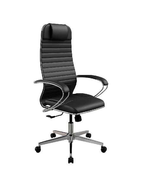 СПИНКА С МЯГКИМ ПОДГОЛОВНИКОМ: каркас стальной с полимерным покрытием черного цвета с хромированным молдингом, ширина 475 мм, высота 860 мм. Обивка: экокожа Extra перфорированная. Вид прошивки: К1. Регулируемый поясничный подпор: стальной хромированный.