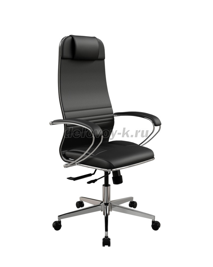 СПИНКА С МЯГКИМ ПОДГОЛОВНИКОМ: каркас стальной с полимерным покрытием черного цвета с хромированным молдингом, ширина 475 мм, высота 860 мм. Обивка: экокожа Extra перфорированная. Вид прошивки: L1. Регулируемый поясничный подпор: стальной хромированный.