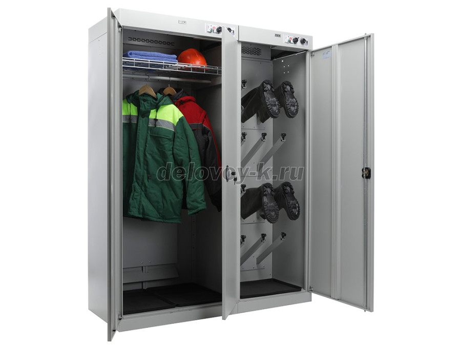 состоит из 2 независимых секций. 1я, 2-дверная - для одежды, с перекладиной и полкой. 2я - для сушки обуви, оборудована патрубками для её развешивания