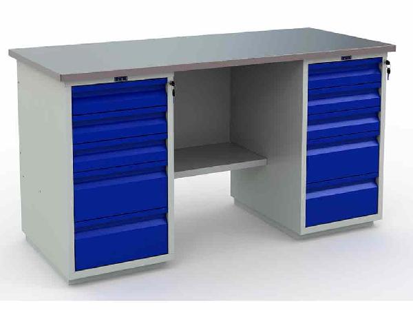 Верстак состоит из 2 тумб WD5. Тумба укомплектована 5-ю выдвижными ящиками. Ящики открываются на телескопических направляющих. Нагрузка на ящик 30 кг. Все ящики закрываются на центральный ключевой замок.
